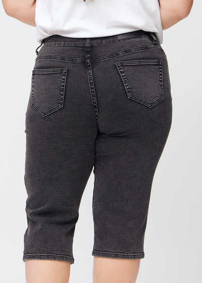 Mørkegrå denim regular capris, modelnavn Shadows, som sidder lige til benet og slutter lige under knæet på en plus-size model, set forfra.